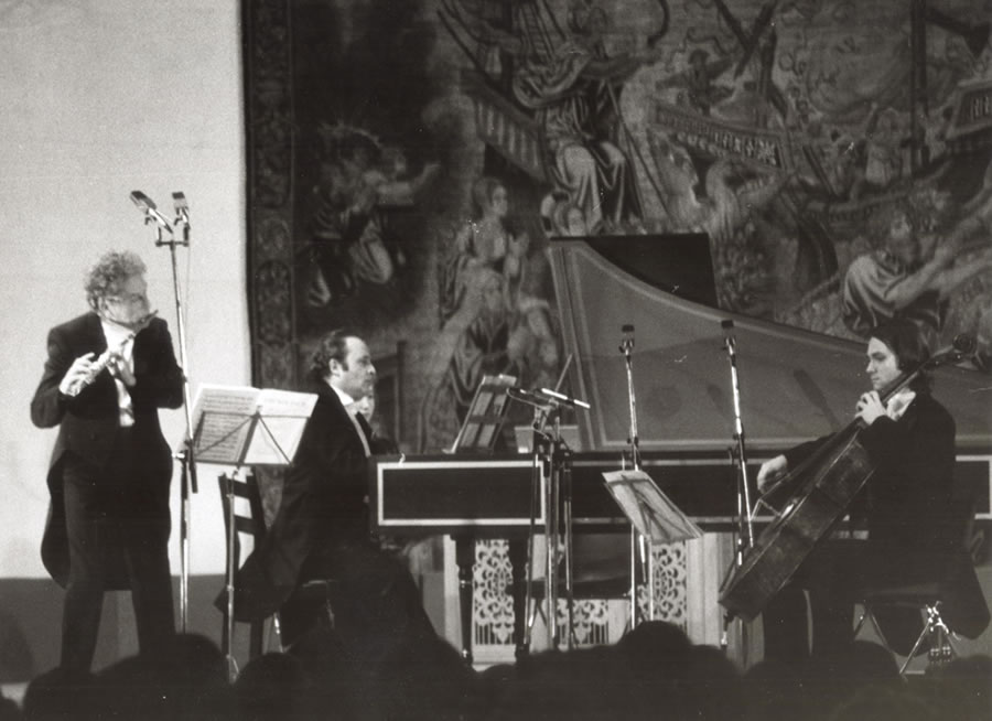 Aurele Nicolet, Alexander Kniazev und Felix Gottlieb beim Johann Sebastian Bach gewidmeten Richter-Musikfestival im Puschkin-Museum 1987